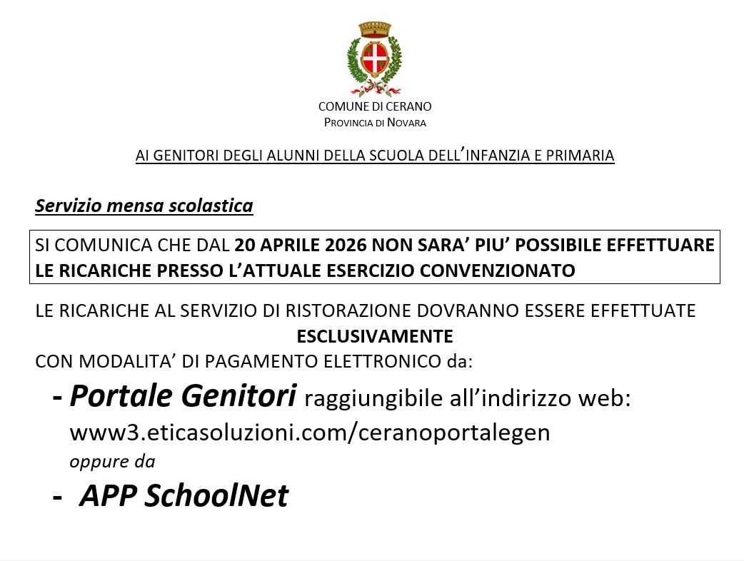Modifica modalità ricarica buoni servizio mensa scolastica