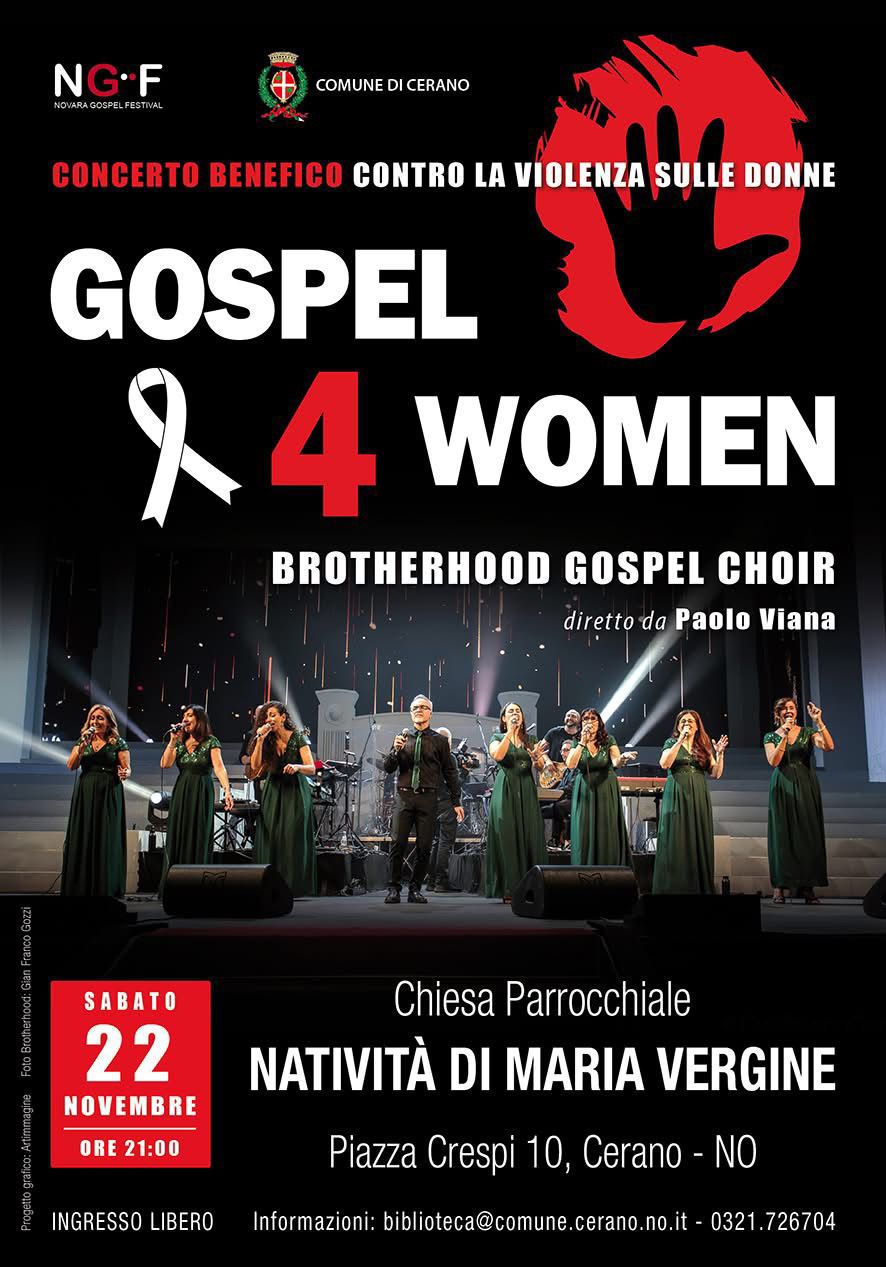 Il Comune di Cerano in collaborazione con NGF Novara Gospel Festival il giorno Sabato 22 Novembre 2025 alle ore 21.00 presso la Piazza Crespi 10, Cerano - NO (davanti alla chiesa parrocchiale) organizza l'evento Gospel 4 women, Brotherhood gospel choir