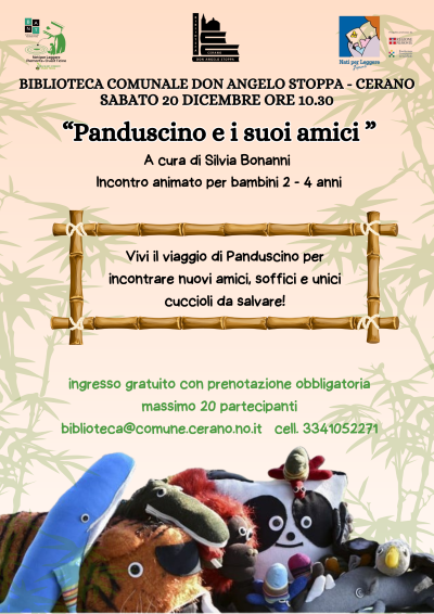 Il giorno 20 dicembre ore 10.30 presso la biblioteca Comunale di Cerano si terrà l'incontro animato "Panduscino e i suoi amici" a cura di Silvia Bonanni