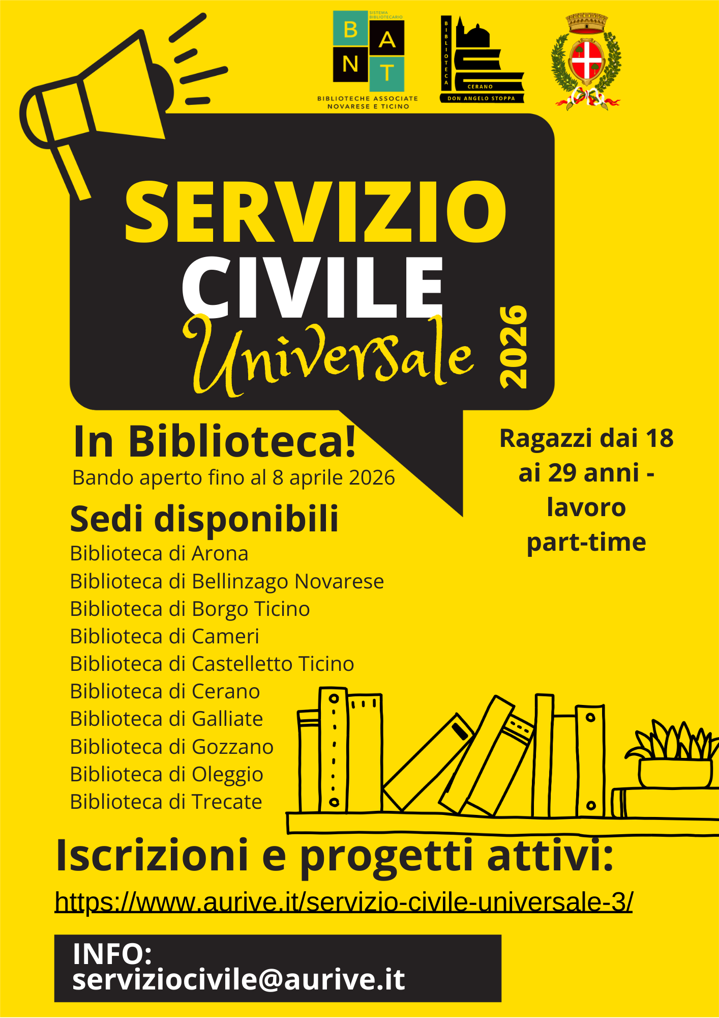 POSTI DISPONIBILI: Biblioteca Cerano: n. 1 posti - 5 giorni settimanali | 12 mesi di servizio | 25 ore settimanali (mediamente) | monte ore annuale 1.145. Età dai 18 ai 29 anni. Compenso: Euro 519,47.