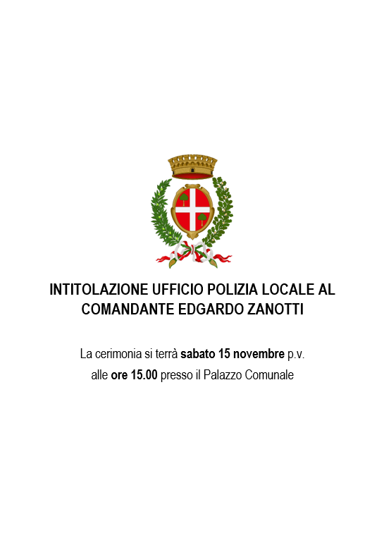 Sabato 15 novembre p.v. alle ore 15.00 si terrà presso il Palazzo Comunale la cerimonia di intitolazione dell'ufficio di Polizia Locale al dott. Edgardo Zanotti, Comandante che ha prestato servizio per la pubblica amministrazione per 28 anni con passione e dedizione.