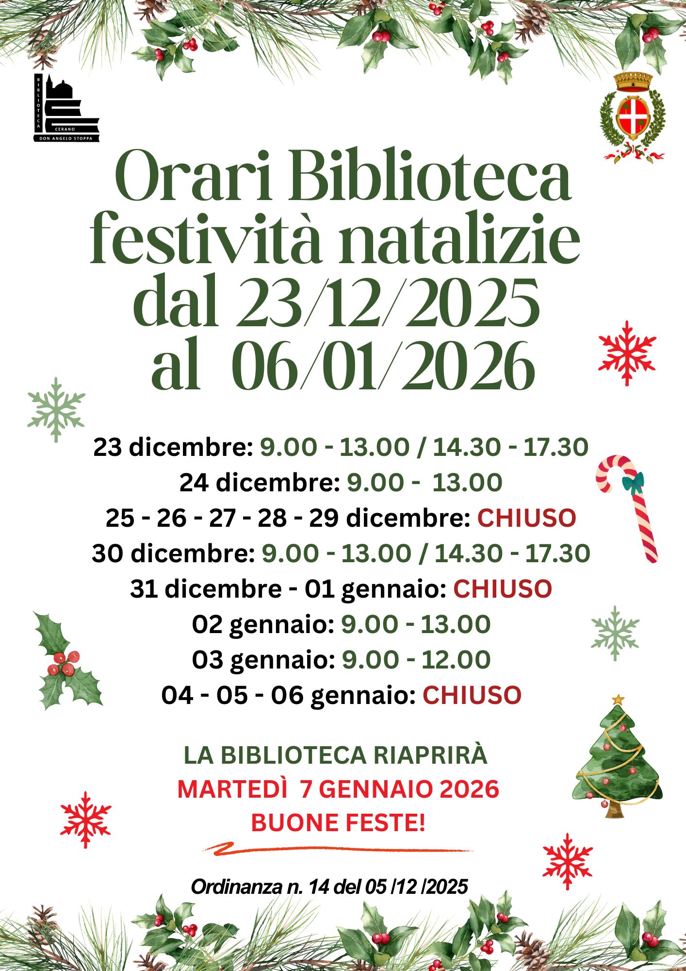 Orari Biblioteca festività natalizie dal 23/12/2025 al 06/01/2026